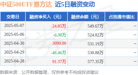本站消息,5月7日,中证500ETF易方达(510580)融资买入245.39万元,融资偿还220.53万元,融资净买入24.85万元,融资余额549.67万元。